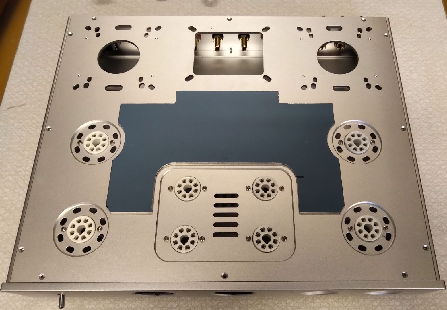 Поэтому для лампового двухтактника с али приобрел вот такой корпус. Размеры: 415х330х70 мм. Брал перед Новым Годом со скидкой. Вышло с пересылкой 187 Евро. с поставленными элементами на передней панели сбоку есть отверстия для настройки режимов единственное что я сделать собираюсь, сверху наложить вот такую накладку, черного цвета, с 2 мм алюминия.