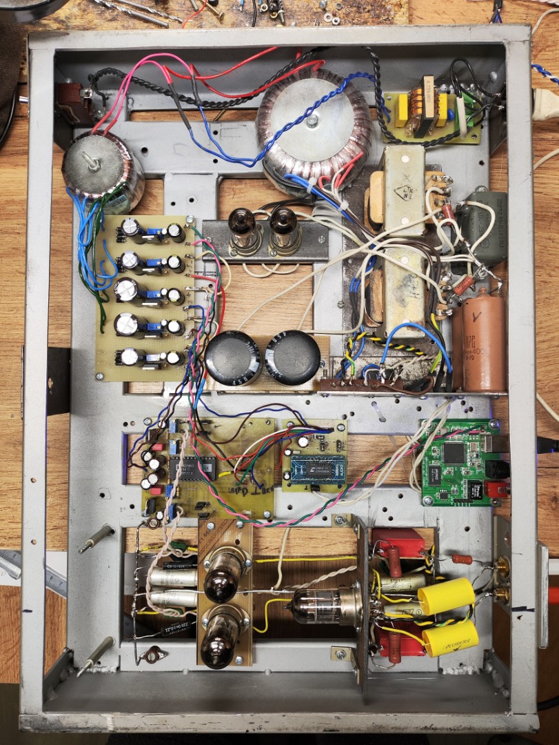 Лампа катодного повторителя горизонтально потому что пробовал в качестве КП 6н6п (с изменением номинала катодного резистора) вертикально она не влазила. В спектре вторая гармоника получилась уж слишком высокая. В итоге вернул обратно 6н1п.