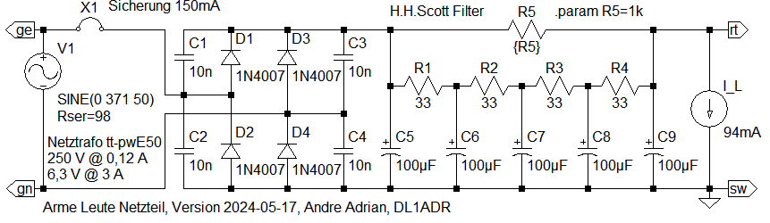 Наведена схема випрямляча живлення просто бомбезна. Особливо в сенсі живлення пульсуючих навантажень. Зверніть увагу, автор не використовує поодинокий конденсатор великого номіналу, а бере кілька їх меншого. Цим досягається зменшення паразитних індуктивностей як самих, сукупно з резисторами малого опору це додатковий фільтр більш високого порядку. Ну і окремі, хоч і фізично невеликі конденсатори сукупно мають більшу реактивну потужність, ніж один. Суто таке використовувалось в ті часи, коли параметр ESR ще не ввели, а воно повинно працювати і з гарантованою надійністю.