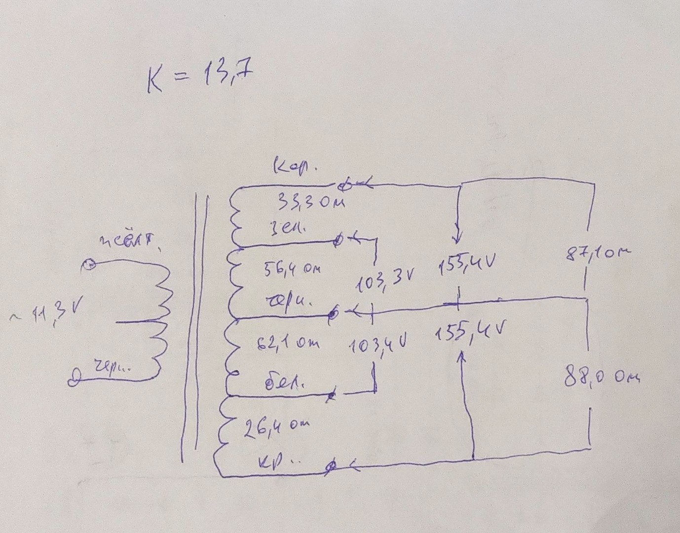 Результат у цій схемі-таблиці. Хотілося б почути міркування. Якийсь дивний спосіб намотки, якщо дивитися на опори одинакових обмоток. Суми опорів (загальні) не зовсім ідентичні, бо міряв в різні часи. Але фунцціонально одинакові обмотки були виміряні в один час.