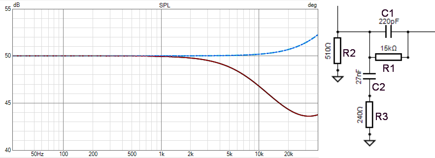 Я к ней добавил C2, R3, которые рассчитаны так, чтобы скомпенсировать снижение АЧХ на ВЧ Вашего усилителя. Коричневая кривая.