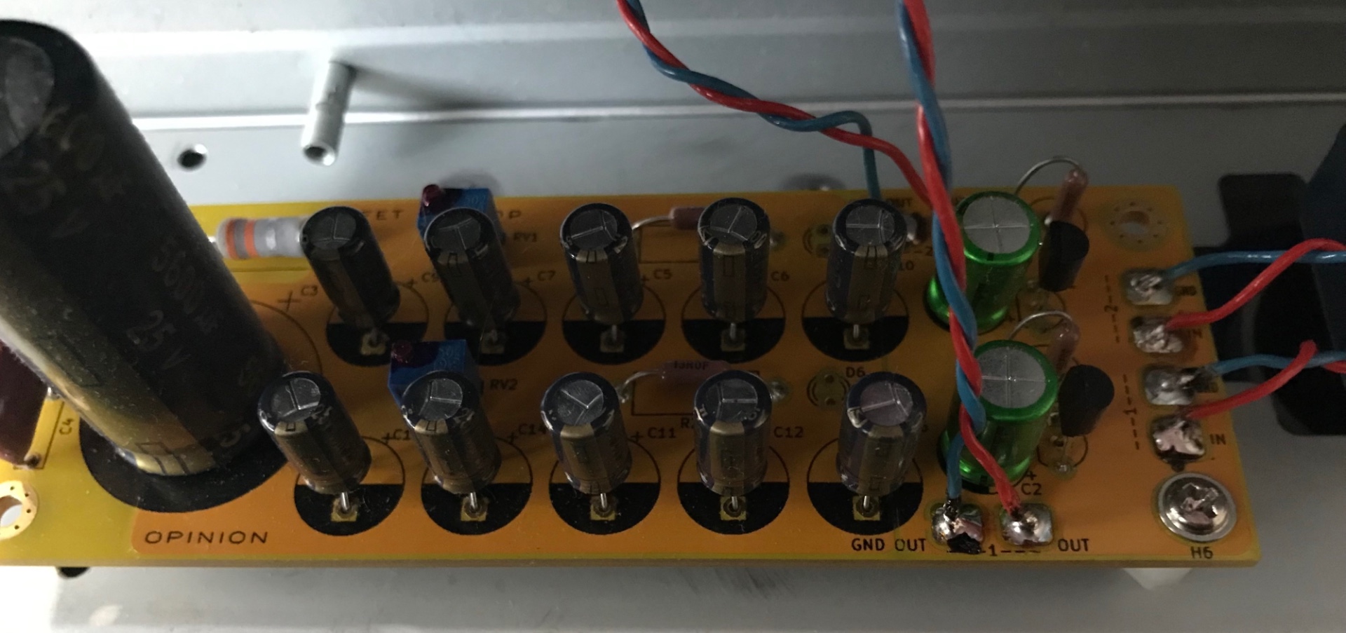 Загадочная плата ))). С торца, судя по всему, приходит сигнал по синим и красным проводам. По сторонам платы он уходит по таким же. Наблюдаем по одному транзистору на канал. Может эмиттерный или истоковый повторитель. Но может, конечно, и усилительный каскад с ОЭ или на полевике. Зачем-то два подстроечника. Для регулировки уровня сигнала? Но что-то далеко они отнесены от транзисторов и сигнальных проводов. Питание подстраивать? Еще и батарея конденсаторов с явным уклоном в китайскую аудиофилию. Двуполярку делать ? Для питания двух транзисторов перебор, но питание на плату только приходит, так что таки для них... Зелененькие кондеры еще ладно, проходные, наверное. Хотя здоровые какие-то. То есть не проблема сочинить схему с использованием всех видимых на фото проводов и деталей, но она будет с явной придурью.