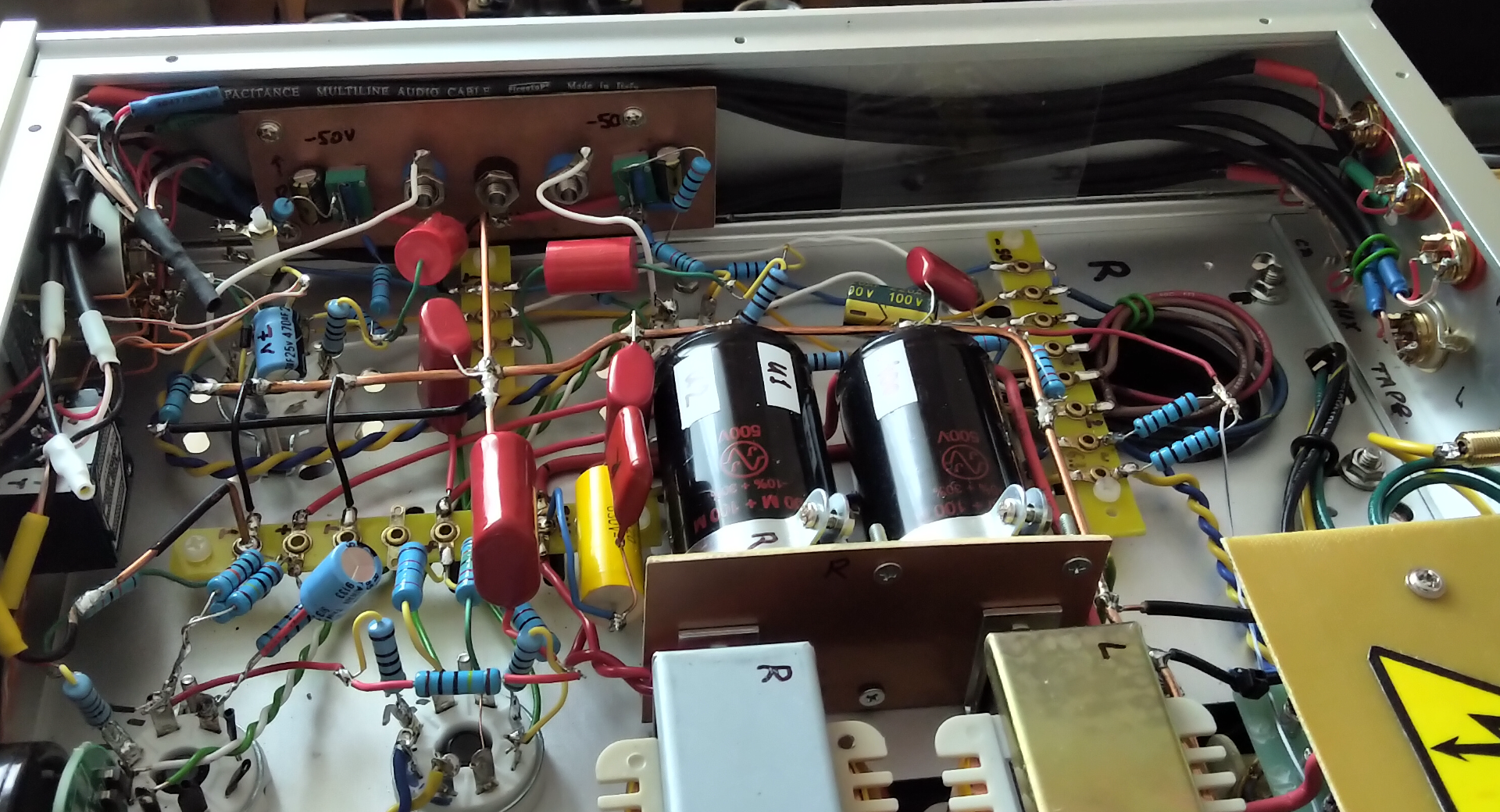 Чи не задовгий шлях для сигналу ? Лівий канал має чутний фон 100 гц навіть при 0-му положенні РГ, при всьому тому що зазначені екрановані кабелі йдуть по стороні правого каналу. Відключав провідник від вх. лампи і замикав - тихо.