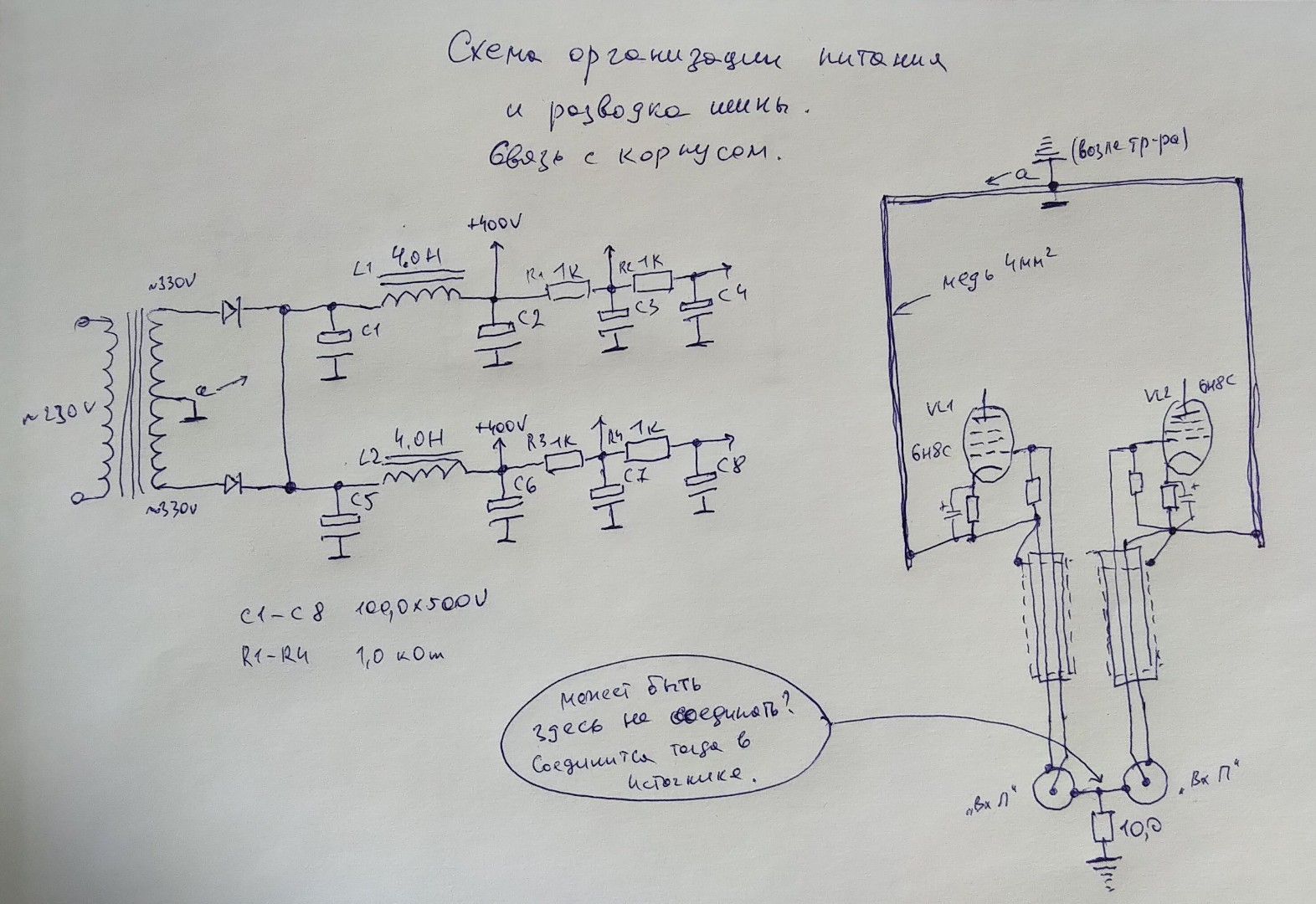 Саме через резистор 10 ом шина приєднана до корпусу. Вона одна на два канали, з кожного до неї підходять відповідні мінусові. На початку під'єднуються низькострумні - екрани входу, мінусові входу, далі мінус катоду вхідної лампи і так далі, до таких, що мають високе значення сили струму. І вже в самому кінці 10 ом і на корпус. Щось схоже на дерево, де коріння корпус, а верхні гілки - то для пташок... ;)