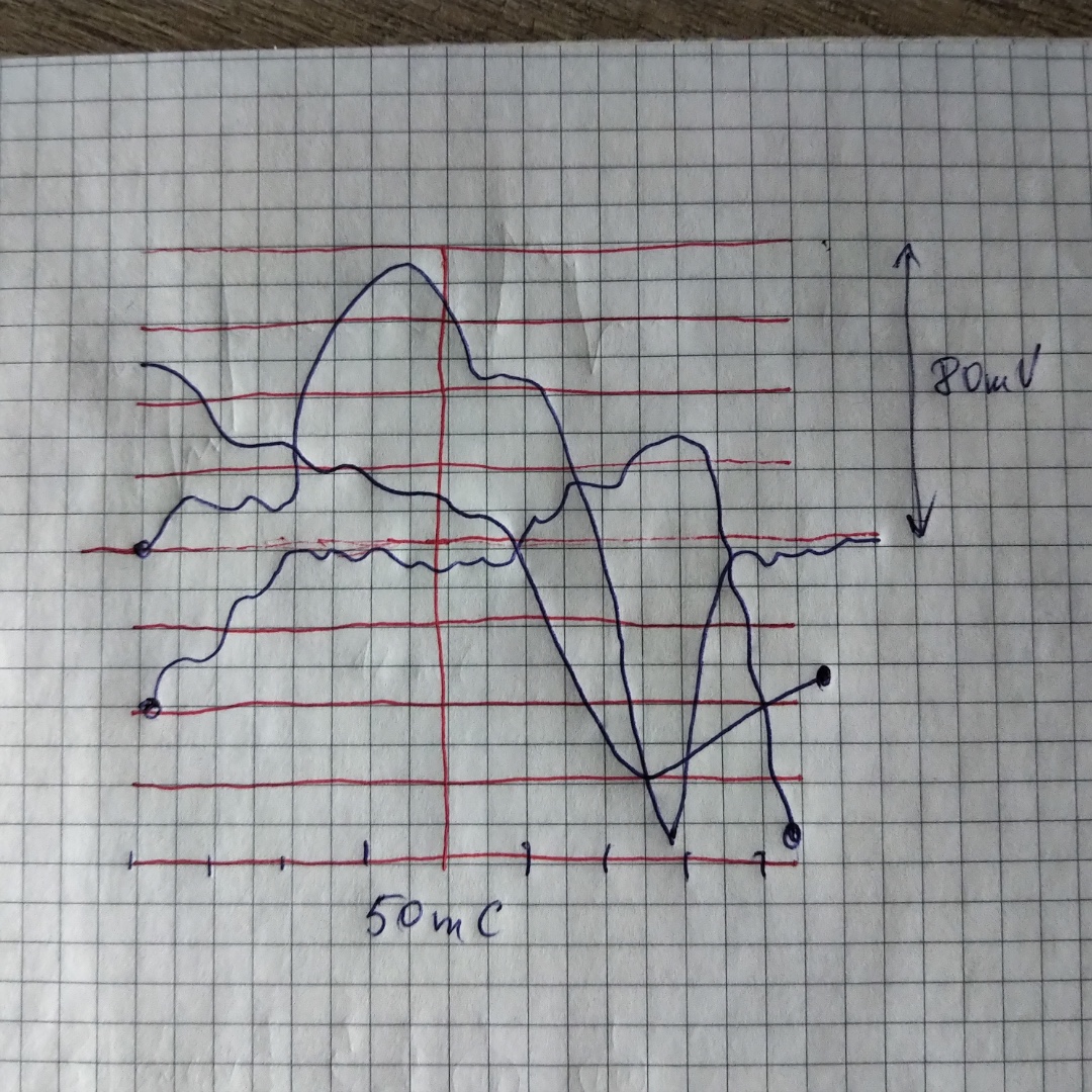 Але більше всього чудить напруга -50 В. Як писав вище, все поміняв і нічого не змінилося. Сфотографувати неможливо, зате нарисував декілька траєкторій по яких витанцьовує ця напруга. Знімав всі чотири EL34 лампи, - не впливають. Форма синусоїди така сама як і на обмотках 6,3В.