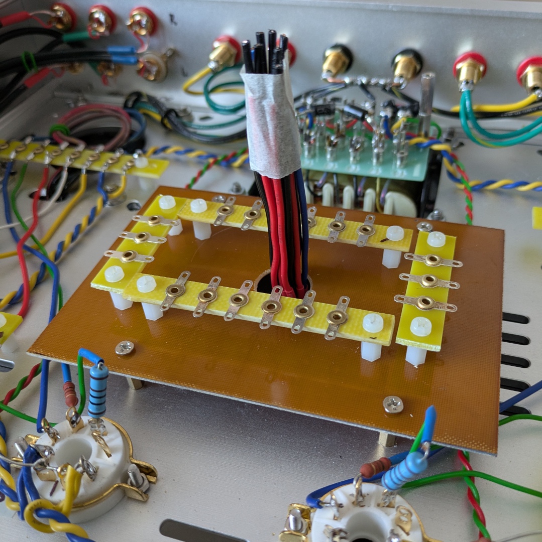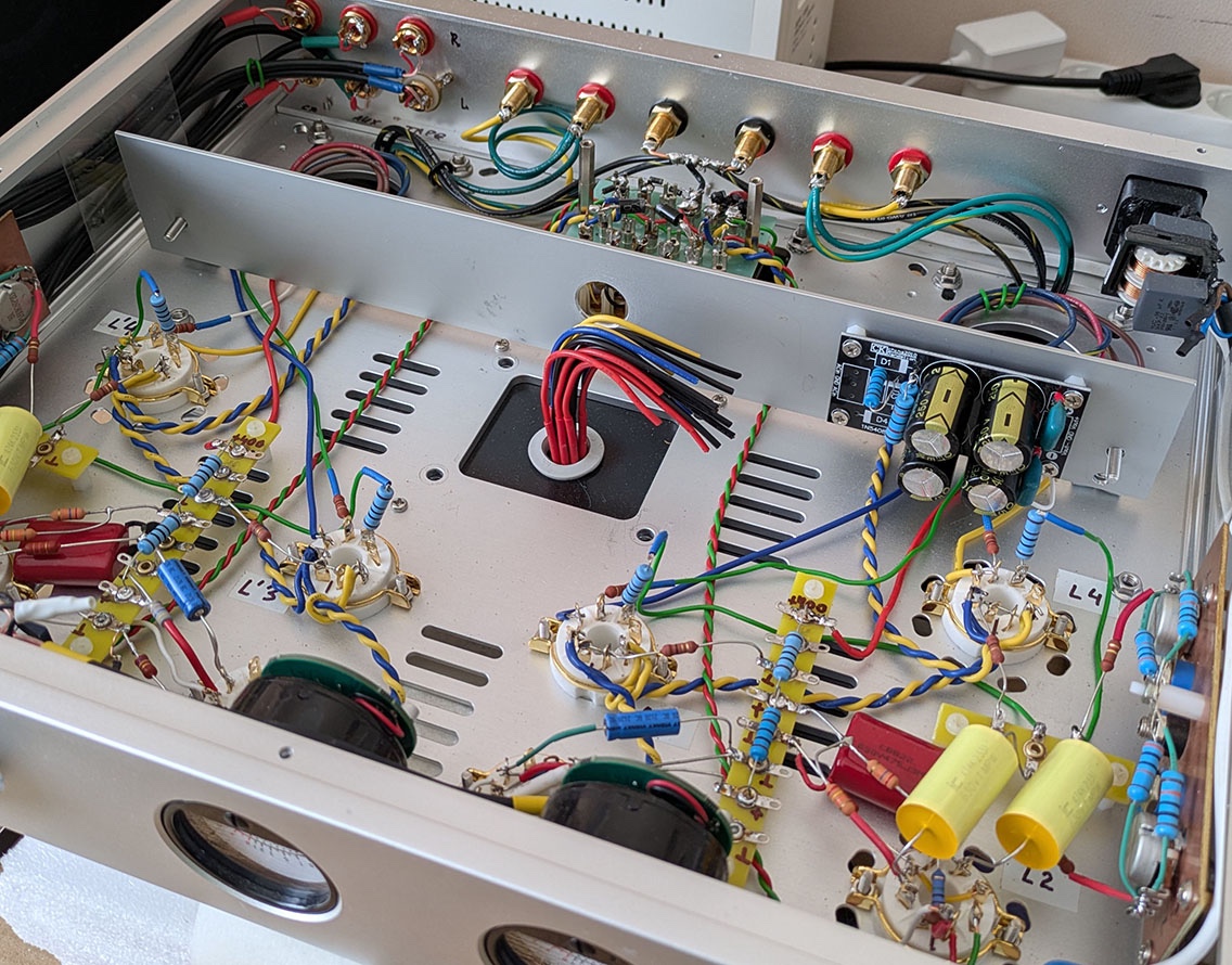 А ось такий вигляд має один канал. Тільки підключити живлення і завести землі в одну точку. Резистори всі на 2 вт. Європейські якісь зовсім маленькі. Як МЛТ 0,5. Метод монтажу перейняв у визнаних японських гуру. Їм певно як і мені було ліньки якось гарно розводити монтажні проводи. :mrgreen: