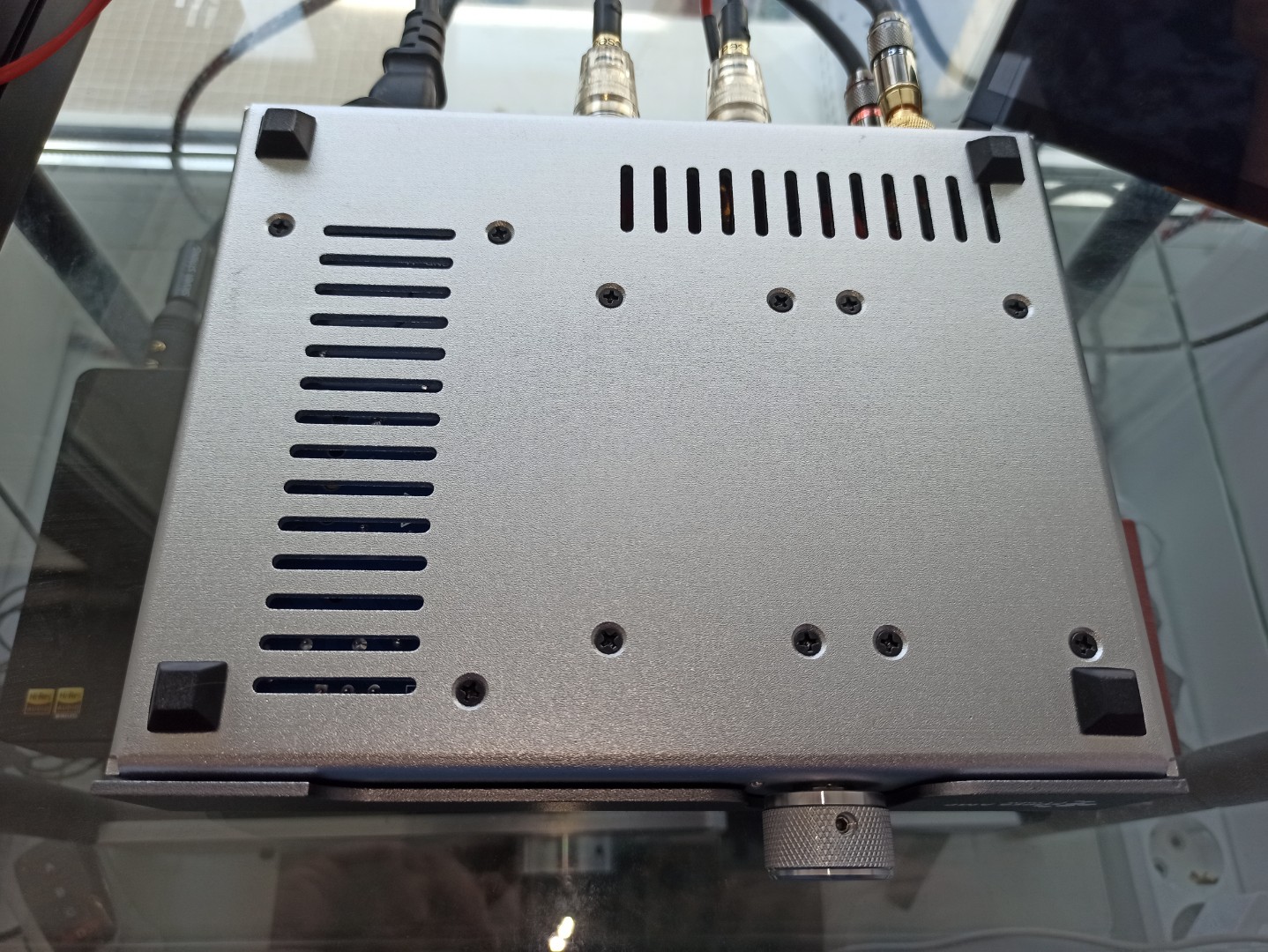 Вентиляционные отверстия красивые, но с моей точки зрения есть подвох - сверху мне кажется они слишком большие, а возможно лишние - тудой легко может попасть вода (к примеру из чашки, которую некоторые умники типа меня держат рядом с усилком на столе) + пыль и грязь всякая - тоже будут там скапливаться. ИМХО - я бы верхние отверстия отменил, боковые сделал меньше в диаметре + снизу корпуса тоже бы сделал отверстия, чтобы снизу воздух заходил. Будет не так красиво, но более практично мне кажется.