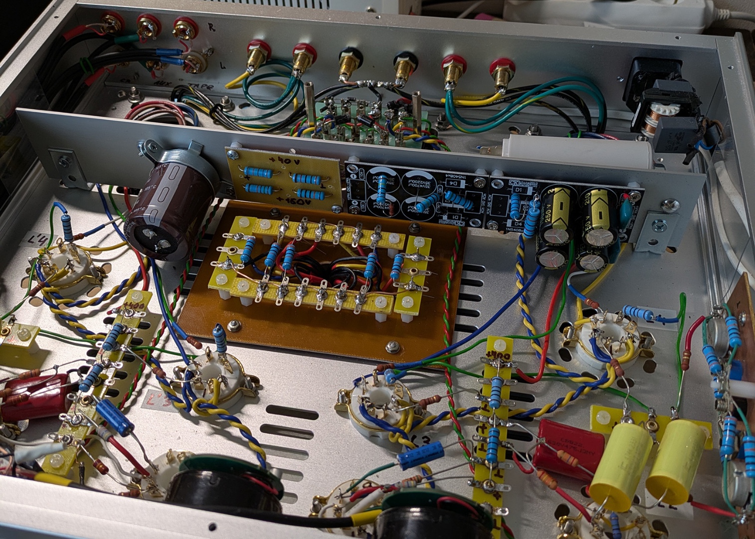 Пріснопам'ятний Губін теж рекомендував в своєму трьохламповому шунтувати електроліти плівкою. Це конденсатори С1, С4. Хоча б лавсаном. Я так і зробив. Погіршення звуку точно не відбулося. А ось в катодах вихідних ламп шунтування поліпропіленом 1 мкФ дало якусь синтетику. Там краще залишити якісний (можна навіть аудіофільський