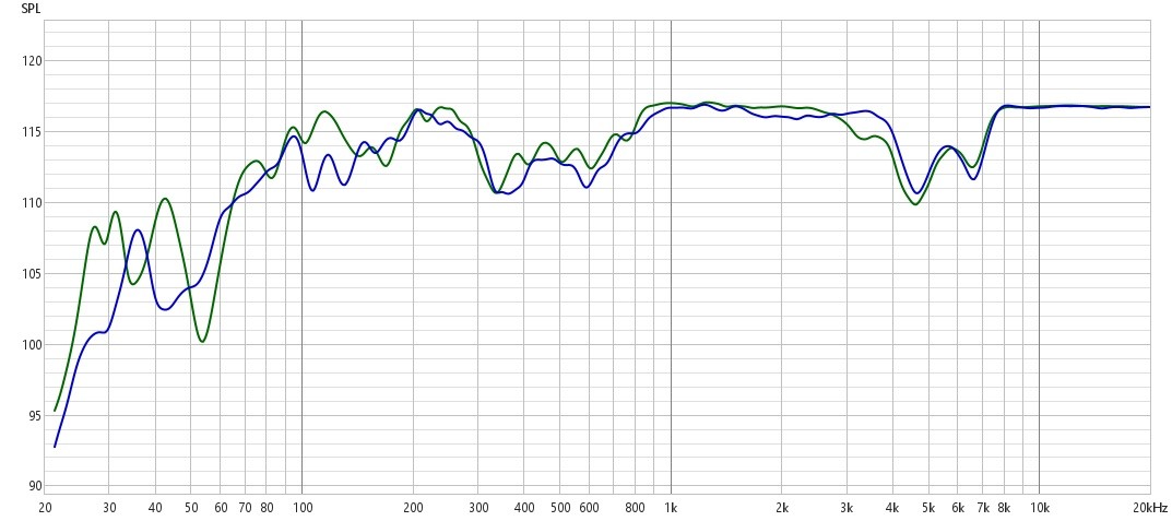 По спаду на НЧ, тоже предположения сбылись, 53Гц по -3дБ относительно 100Гц и 45Гц по -6дБ.