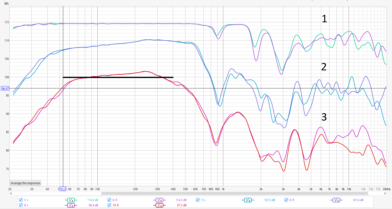 Сделайте измерения свипом с места прослушивания. Правя АС, Левая АС и обе вместе.