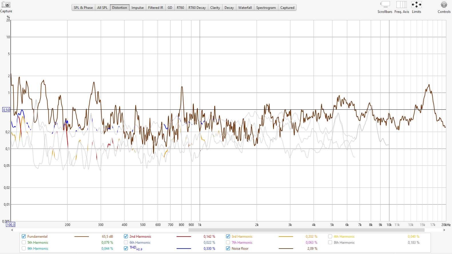 От 100Гц до 2кГц меньше 0,3-0,5% (и то местами), выше - вообще за шумами не регистрируется.