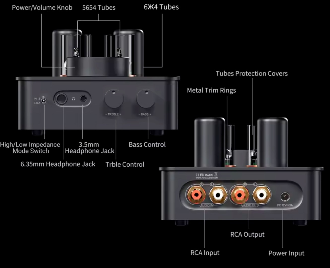 Усилитель оснащён четырьмя вакуумными лампами: двумя 5654W и двумя 6Ж4, обеспечивающими двухступенчатое усиление. Лампы 5654W усиливают напряжение, а 6Ж4 отвечают за усиление мощности. Это обеспечивает сбалансированное, прозрачное и детализированное звучание. Пользователи могут менять лампы, подбирая звучание под свой вкус — для гибкой и увлекательной настройки.