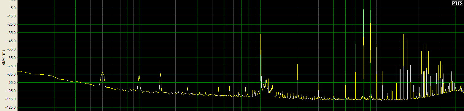Когда стоял выхлоп на ОУ спектр был практически такой-же, только вторая гармошка была ниже третьей. Ну и стало интересно сравнить звучание этого цапа с другим на ES9018k2, тоже самодельным на основе китайской платки + навороченный выхлоп. Вот его спектр.