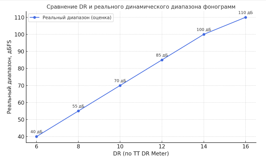 У фонограммы с DR10 на практике динамический диапазон (от самого тихого слышимого сигнала до пика) обычно находится в пределах 60–80 дБ.