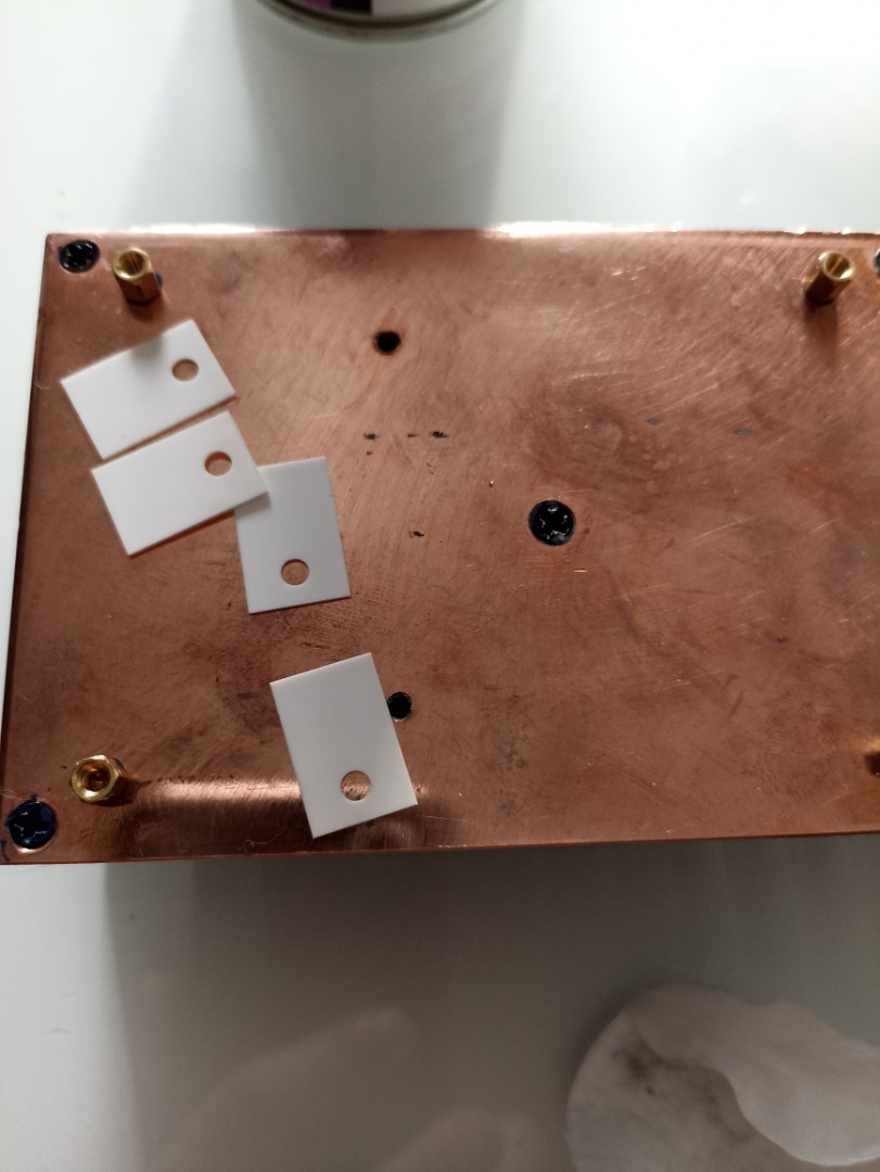 Но самое главное, и не очевидное для меня. Это подкладки под транзисторы. Те, что идут в комплекте теплопроводность 1В/м, но оказывается есть недорогие из оксида алюминия Al2O3 25В/м. Разница в температуре кристалл-радиатор 30 Градусов, Карл! И это только от смены подкладок. Тряпично-силиконовые в топку! Ведь и электропроводность оксида алюминия лучше напряжение пробоя 25кВ/мм, против 15 у силиконово-тряпичной.