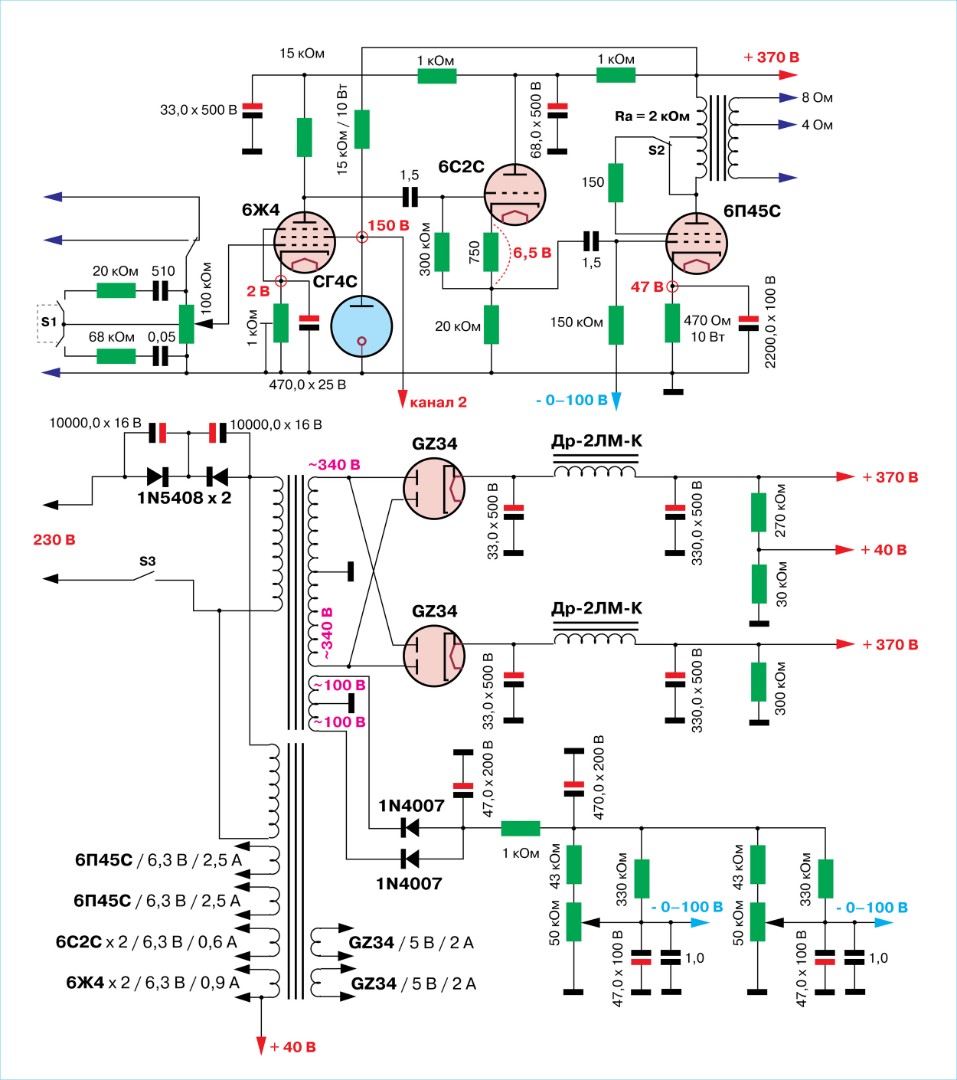 Силовые трансформаторы (анодный и накальный) на тороидальных сердечниках питаются через фильтр отсечения постоянной составляющей напряжения сети.