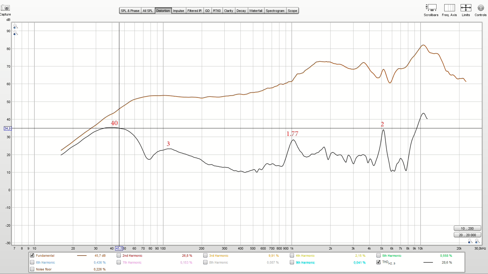 Отсутствие глубокого баса, несмотря на показанный ровный от 30Гц осевой график АЧХ (интересно бы на внеосевые взглянуть