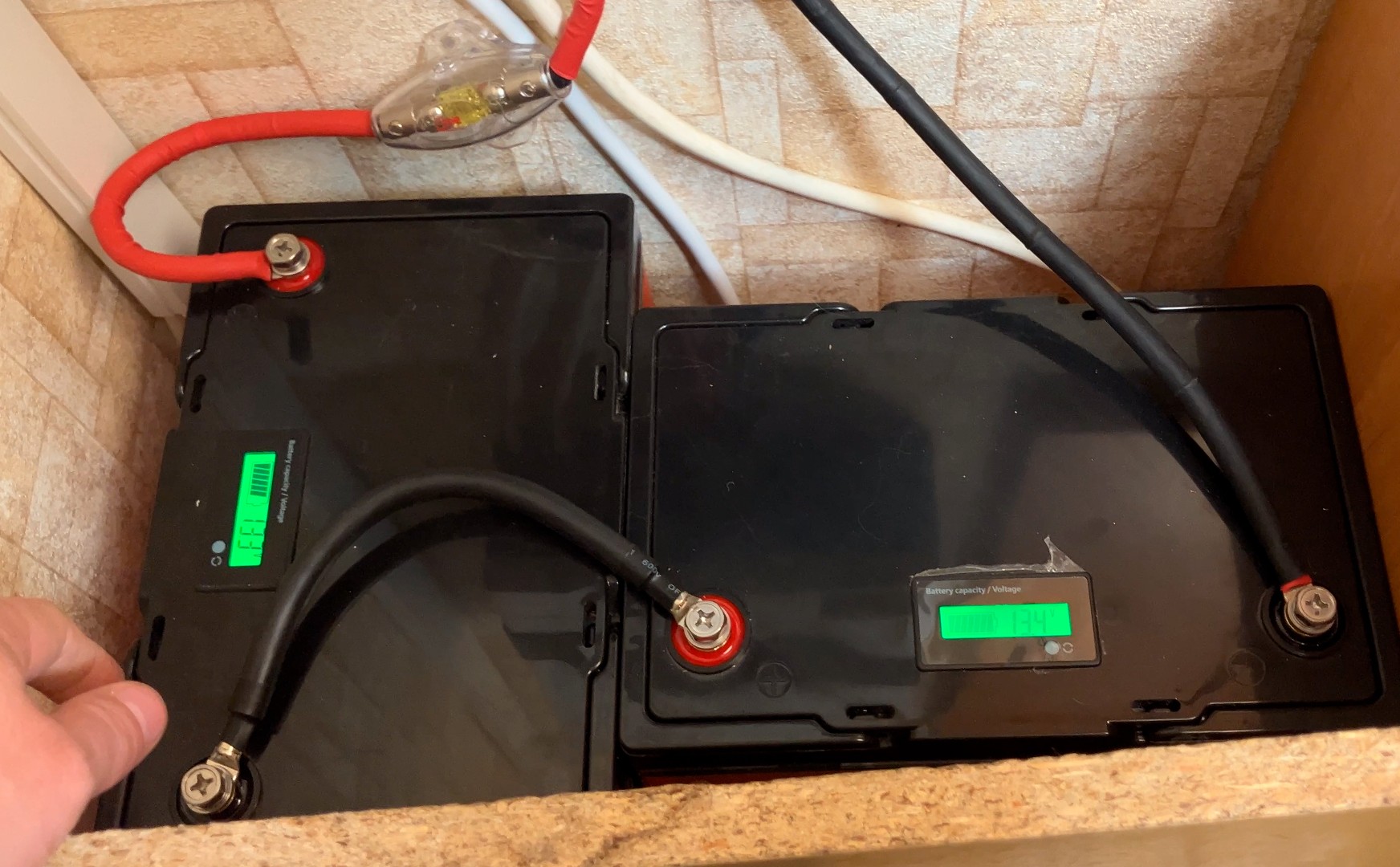 Чтобы получить 24 В, я последовательно соединил два аккумулятора LiFePO4 Anvolan по 12 В, 100 А·ч каждый. В итоге получилось 24 В, 100 А·ч, что даёт запас энергии около 2.4 кВт·ч (24 В × 100 А·ч). Эти литий-железо-фосфатные аккумуляторы считаются надёжными и долговечными — выдерживают сотни циклов зарядки-разрядки.