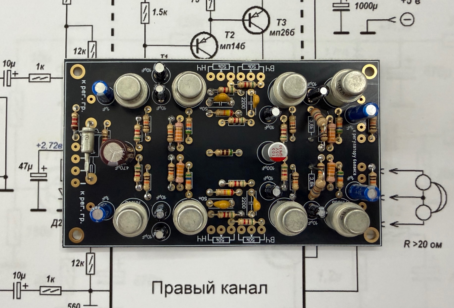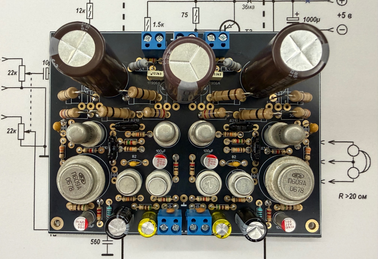 До речі в мене цей підсилювач зібраний на такій же самій платі,особисто знаю цю людину хто її розробляв,і в кого ти купував.Він з Харкова.В мене зібраний на підібраних П605А-8 штук.воєна прийомка.Вихідна потужність 10 Вт.В комплекті з акустикою Dual CL-35 з чуйкою 95 дБ.звучить чудово,(вінтажна лампова акустика).Дуже мелодіний підсилювач.Але для джазу,вокалу,інструменталки. акустичних інструментів.Маю зібраний й налаштований JLH -1969.і скажу так, Беслік мало чим відрізняється від нього.Маю Yamaha A1000,І от для порівняння між цими двума підсилювачами.Вони мало чим відрізняються від Yamaha A1000,хіба що в вихідній потужності і в деяких невеликих незначних нюансах.