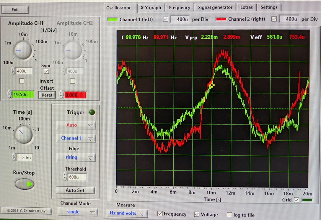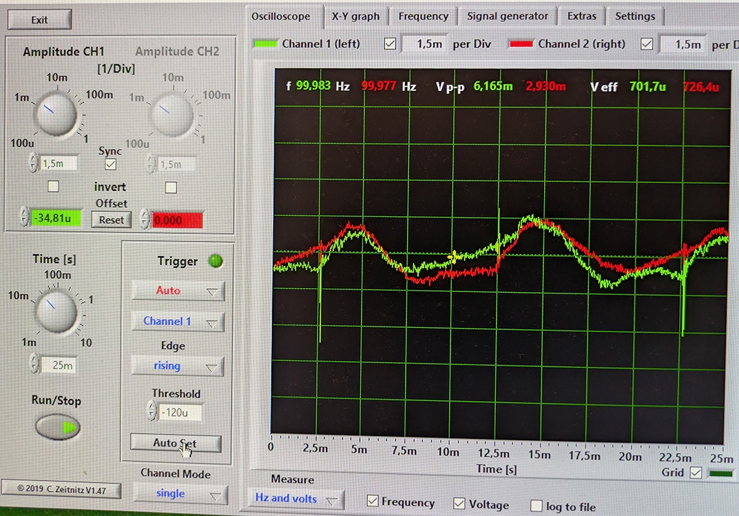 Выходы нагружены сопротивлениями по 10 Ом и паралельно выходу подключил наушники. РГ выведен в 0.