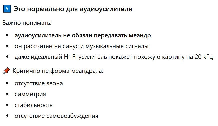 Мне вот интересно, вы хоть понимаете что меандр 20кГц занимает полосу частот намного выше 20кГц, т.е. если меандр ограничить полосой частот 20-30000Гц то вы не увидите на выходе усилителя меандр 20кГц.Rum писал(а): 13 янв 2026, 23:26 Ну хорошо – я вполне разделяю тезиз о том, что на выходе усилитель должен повторить сигнал со входа увеличивая лишь его амплитуду.