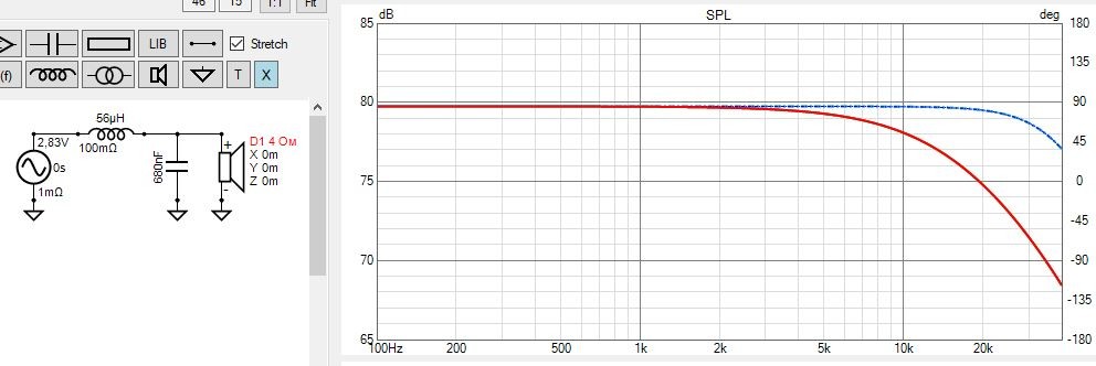 Вот так меняется АЧХ при 22мкГн (синий) и 56мкГн (красный) для ёмкости 0,68мкф и импедансе нагрузки на ВЧ 4 Ом.