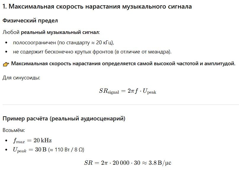 Транзисторы 60-х и начала 70-х имели низкую граничную частоту. Чтобы усилитель работал стабильно и не превращался в радиопередатчик, разработчикам приходилось жестко ограничивать его полосу пропускания с помощью конденсатора коррекции Миллера в каскаде усиления напряжения (КУН). Это делало усилитель медленным «внутри».