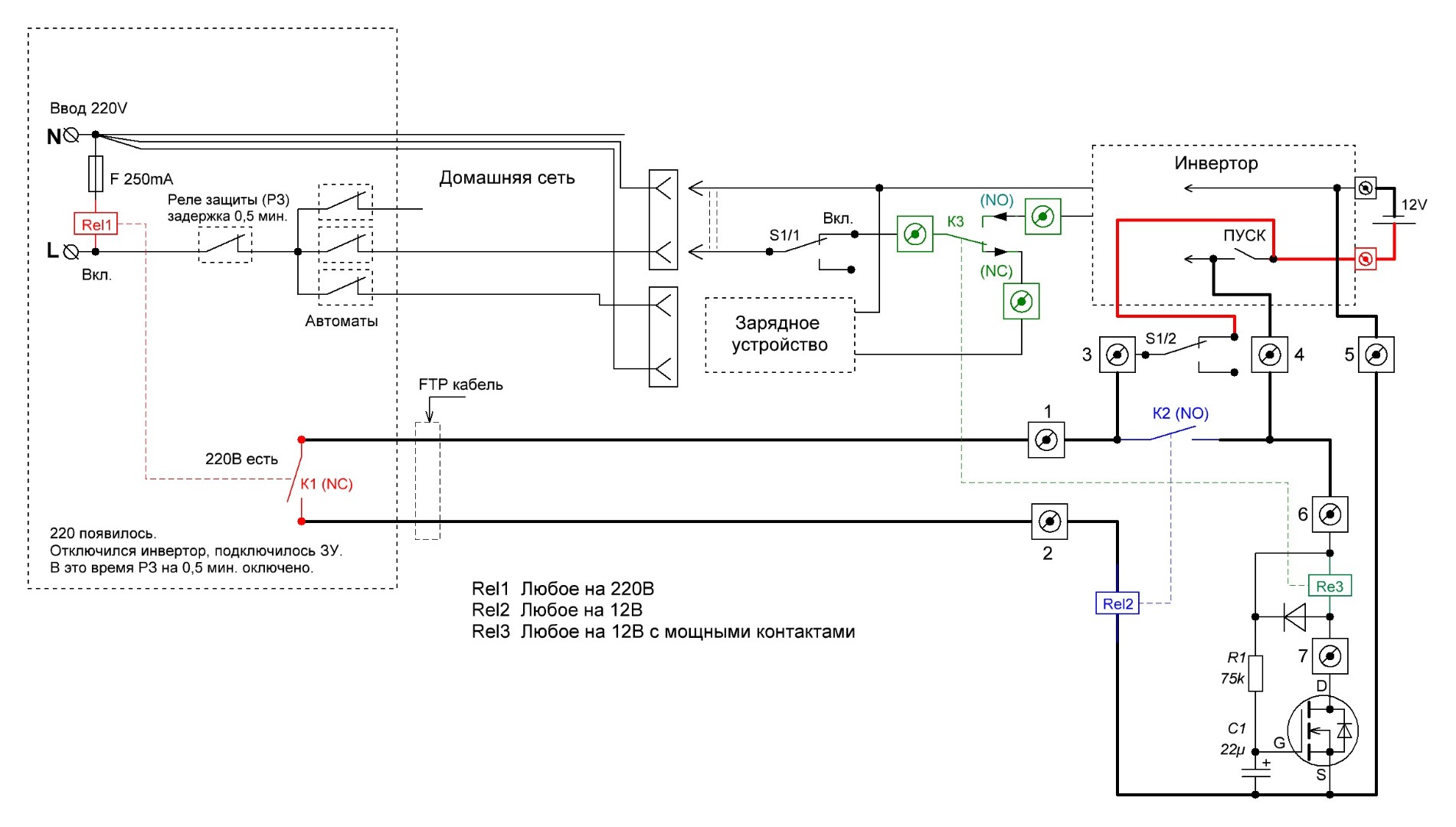 Чтобы упростить себе жизнь, сделал приспособу для автоматического включения инвертора при пропадании света и автоматического выключения после его появления, с последующим подключением зарядного к АКБ.