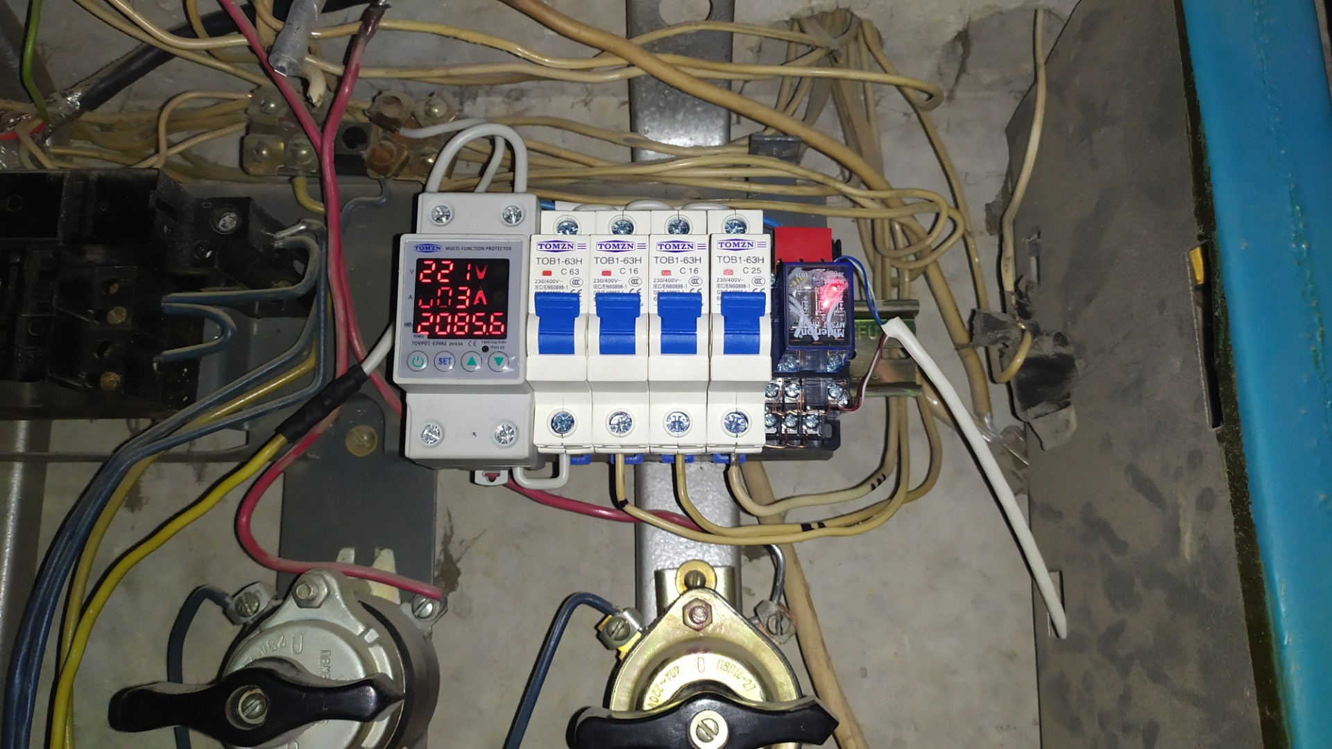 В эл. щитке находящемся на лестничной площадке, дополнительно установил контактор и датчик напряжения. Плата управления с ещё одним контактором, будут находиться внутри зар. станции. Связь между устройствами, по свободным жилам интернетовского FTP кабеля проходящего через эл. щиток.