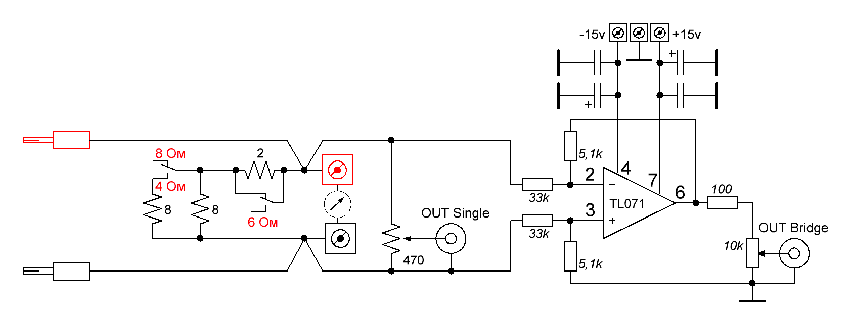 Когда подключаю данный усилитель к звуковой карте (небалансное подключение, один канал, выход карты на вход усилителя через разделительный конденсатор; выход усилителя на мощный резистор 8 ом и далее на вход карты, через делитель) ток потребления начинает расти и срабатывает защита усилителя. Подозреваю что это из-за подключения с общей землей входа и выхода.