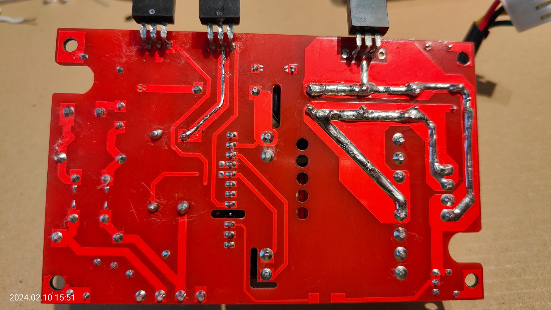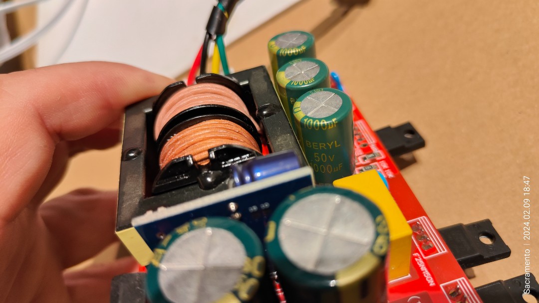 Кстати, встроенный блок питания имеет переменный резистор регулировки вольтажа на выходе и по умолчанию был настроен на 48В, что хорошо. И даже конденсаторы там стоят с хорошим номиналом, Просто решил заменить их на настоящие брендовые. В общем с блоком питания полный порядок.