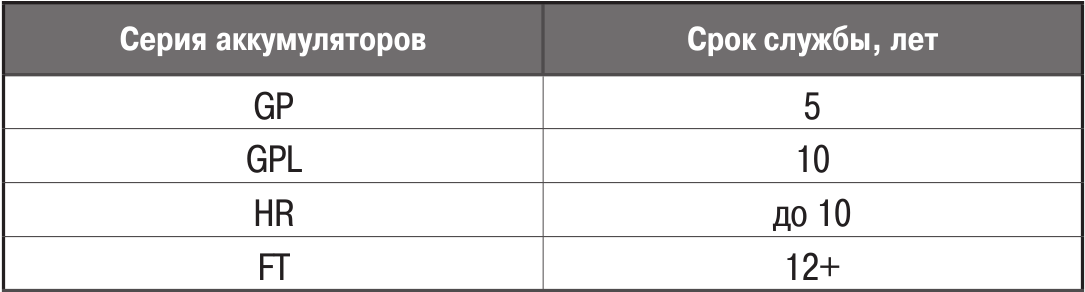 Таблица чисто сравнительная. Из которой можно сделать вывод, что FT прослужит дольше чем GP.Расчетный службы в режиме непрерывного подзаряда при температуре 20°С приведен в таблице. Фактический срок службы сокращает-