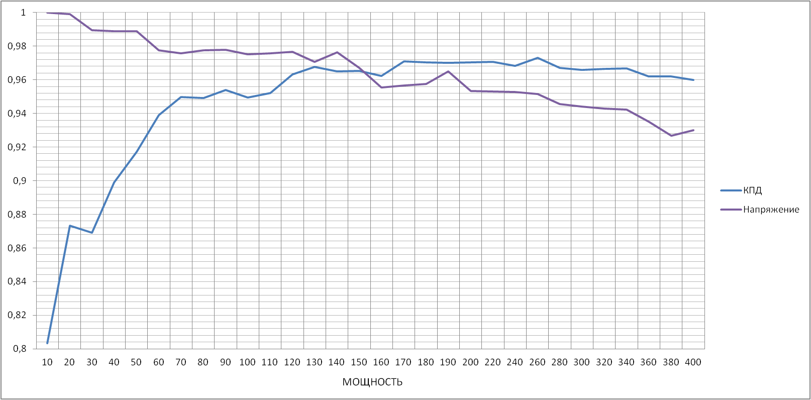 КПД от выходной мощности и нормализованное выходное напряжение.