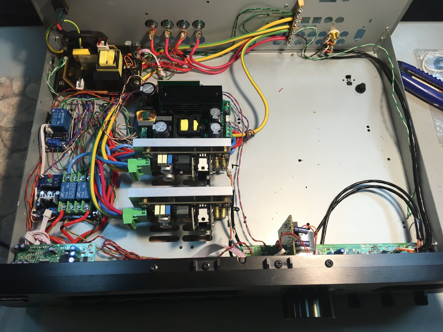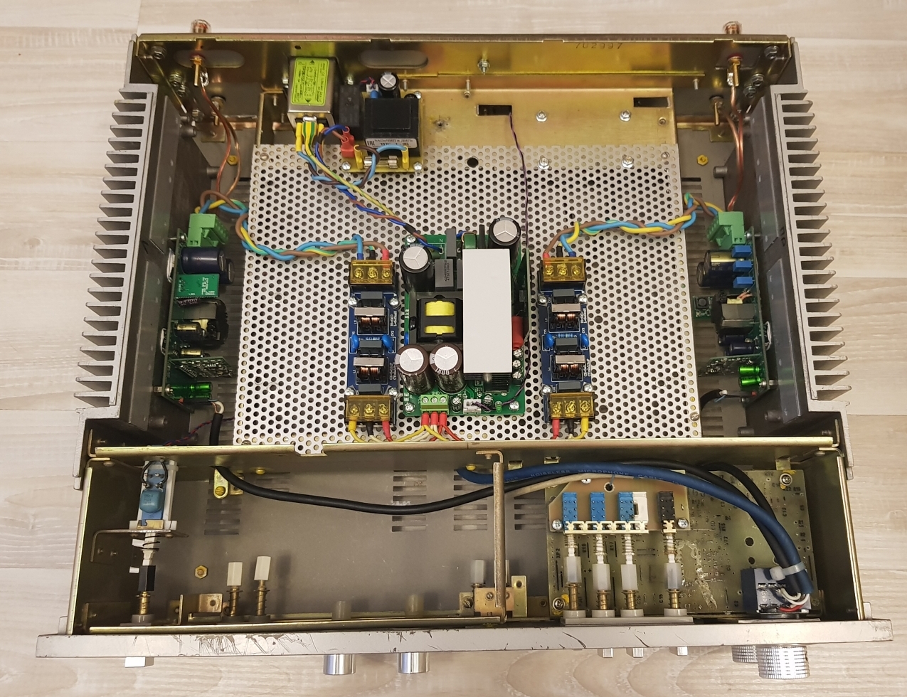 Дособирал сегодня усилитель в корпус. Платы 1_021, питание +-35В. Клубок проводов причёсывать не стал, как хорошо заработало так и пускай.