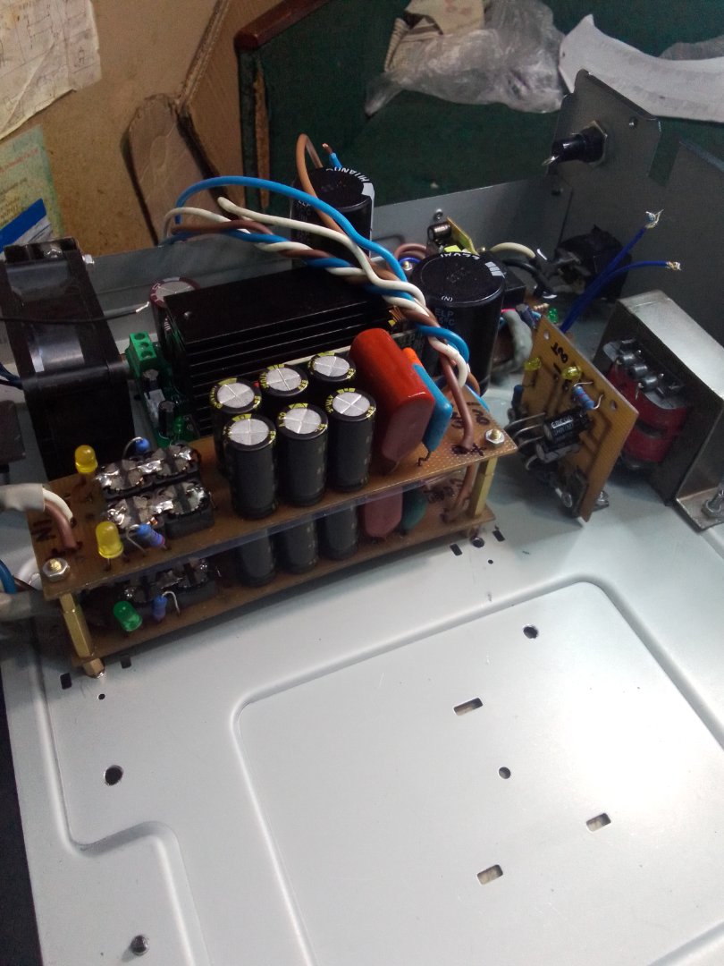 продовжую збірку. буде повний підсилювач з всіма функціями. просто дві платки і блокживлення мені таке не подобається. наразі зробив дві плати сплітера. плату включення 220 на реле з дежурним блоком живлення. додаткове живлення +-12 в та +5в. вентилятор на обдув блока живлення на 8в щоб нечутно легко крутив. (24в вентилятор). ще буде селектор.темброблок, світлодіодний індикатор. плата захисту. регулятор гучності нікітіна зпультом.конденсатори в блоці живлення замінив на 220мкф*450в.