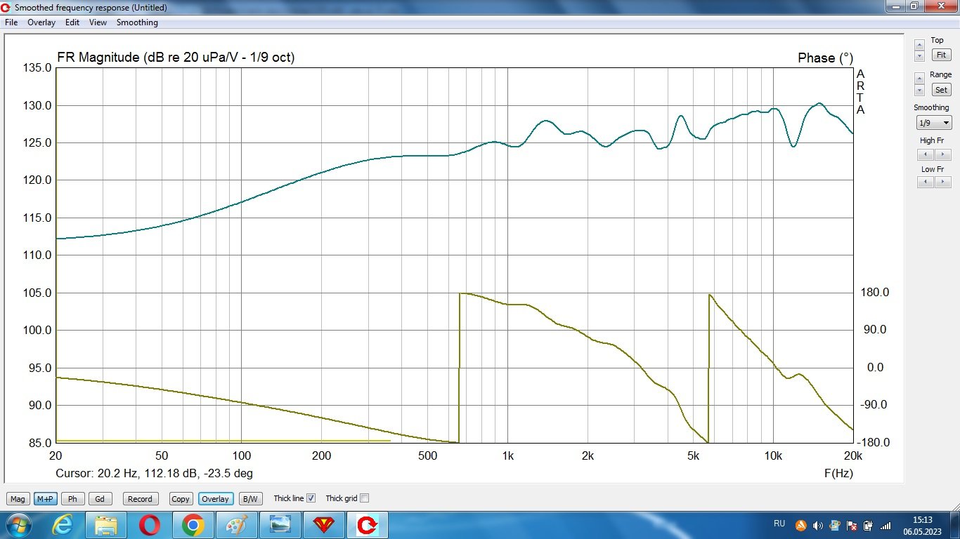 Какое окно выбрать чтобы увидеть АЧХ ниже 300Гц? Возьмите 6мС. Ничего что волнисто, ход АЧХ виден, нам главное правильно свести фазу СЧ и НЧ. Можно сгладить до 1/3 окт.