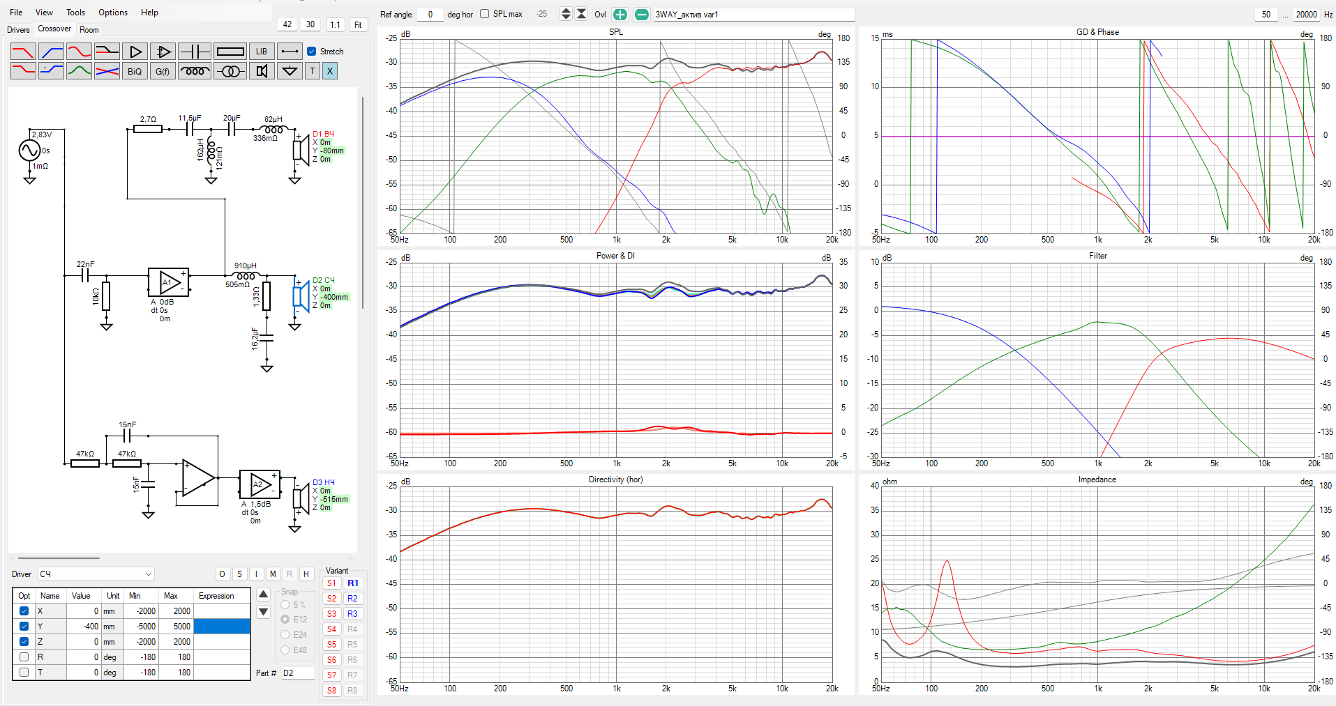 Вот, в первом приближении так. Правда, яма на нижней середине и какие-то "сопли" на графике направленности в р-не 5к. Фильтр сч+вч не изменился. Небольшие переделки в активном кроссовере.