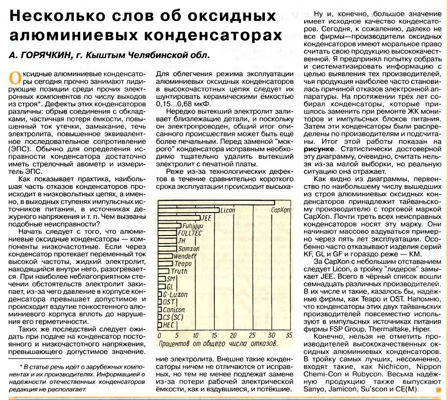 Есть и другие мнения.outlaw писал(а): 30 апр 2024, 12:19 Понимаю, что тут на форумах живут только два полярных мнения. По мнению одних, годится как минимум ELNA или Mundorf, самых крутых серий, от 100 евро за штуку. По мнению других даже King Sun слишком хорош и аудиофиличен, надо немедленно выпаять и заменить пухляками со старых материнских плат.