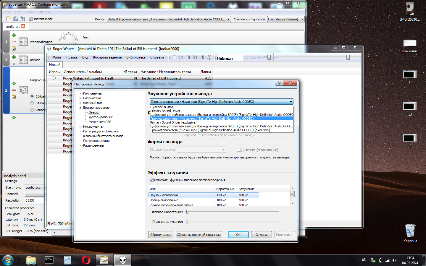 doby5 писал(а): 04 мар 2024, 08:41 EQ APO не работает...звук вообще не выдает видимо SigmaTel Audio не поддерживает. ну да ладно пробовал в фубаре использовать EQ не плохо.