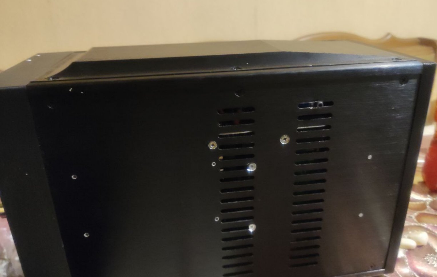 Возможно потом поставлю, есть там у меня супер тонкий и очень тихий кулер. На всас или выхлоп не хочу, чтобы пыль не собирал, а просто обдув внутри, а горячий сам через боковые отверстия выйдет.