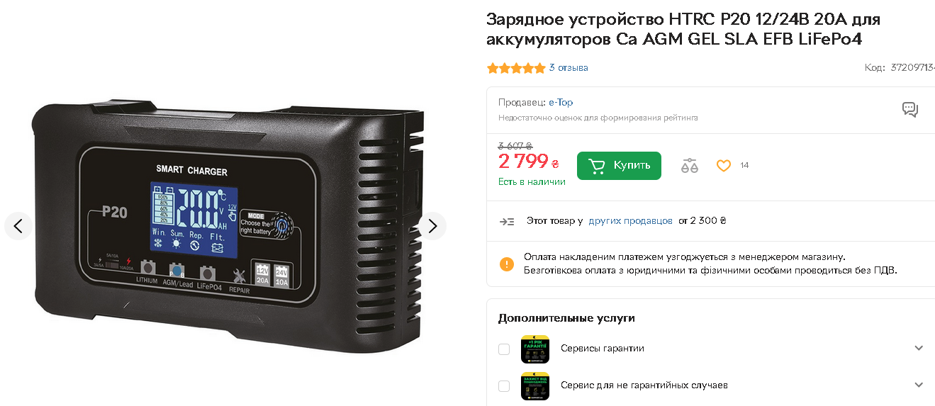 Вообще у меня были сомнения о реальных 20А, да и контакты с проводами там не 20 амперные... Внутри стоит обратноход и транс не сильно больших размеров, выжимать из него 20А весьма сложная задача. В общем если нужны реальные 20А то нужно БП собирать самому. :D А так, зарядка хороша тем, что компактная и умная, но цена у нас на неё, явно завышена. Кстати я её брал за 2200грн, на следующий день она уже стоила как на картинке.