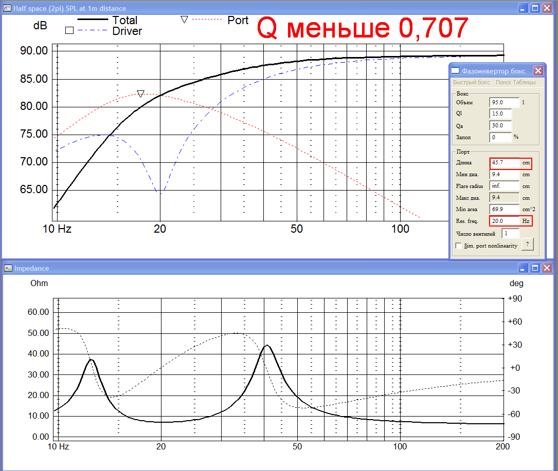 Длина порта 3,1 см. Его резонанс 45,8 Гц. Добротность намного больше оптимальной (для поклонников «уханья»).