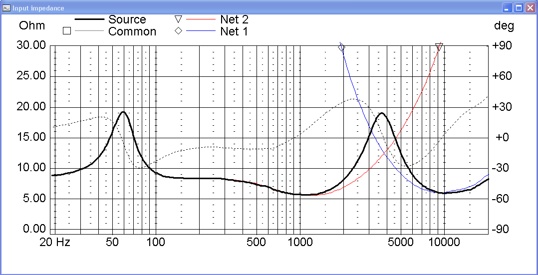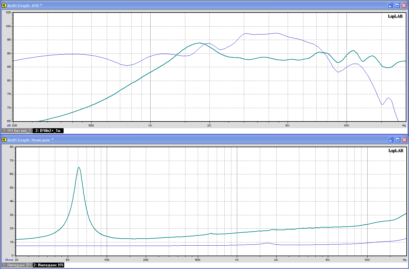 Что можно сказать по АЧХ. Если этот ненужный, «ярчащий» широкий горб 1,5 – 7,5 кГц (высотой 7 дБ) отрезать, то уровень станет сопоставим с пищалкой. А ФВЧ, поднимет её уровень ещё на один-два децибела. Но пик резонанса (1750Гц) нужно давить очень хорошо.