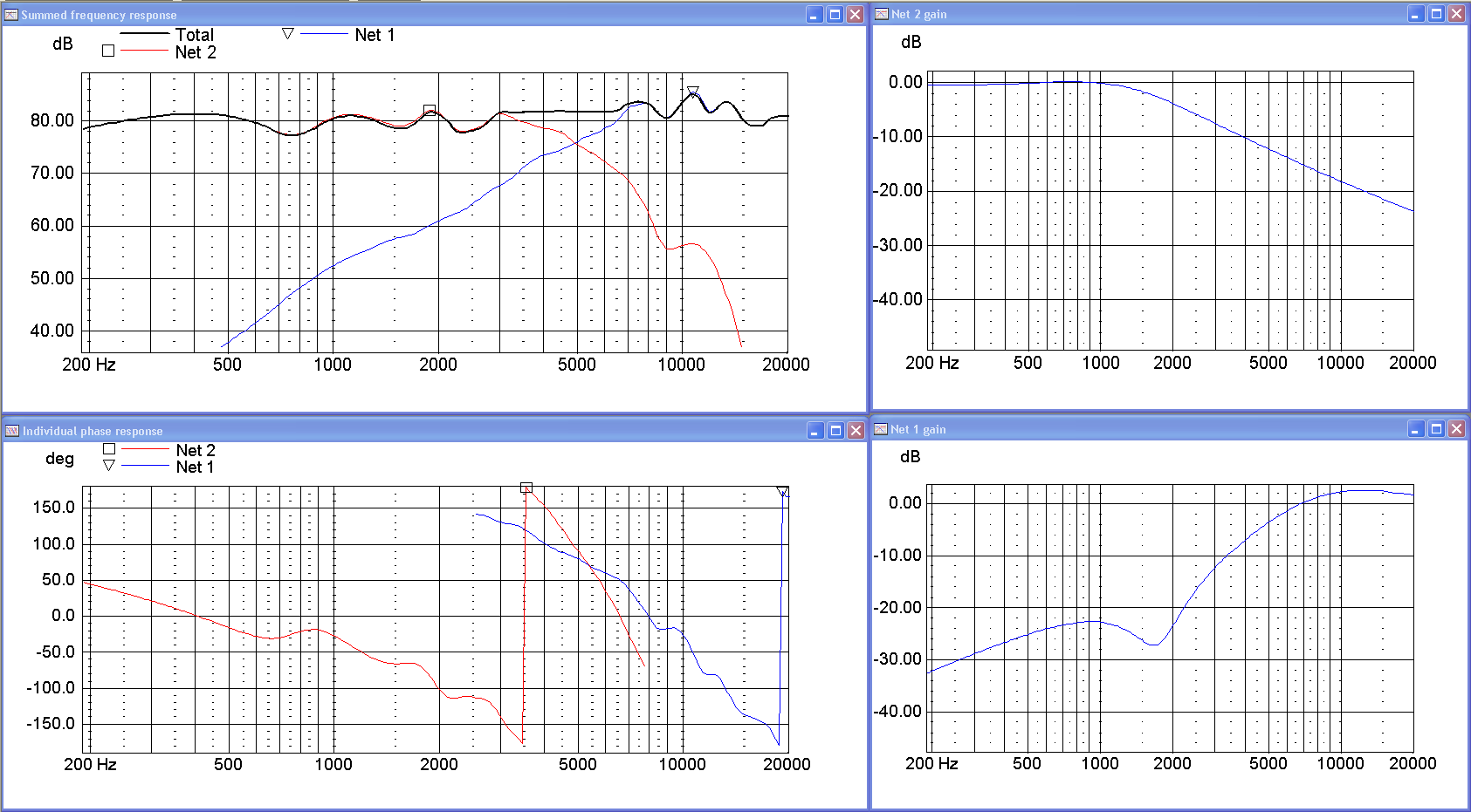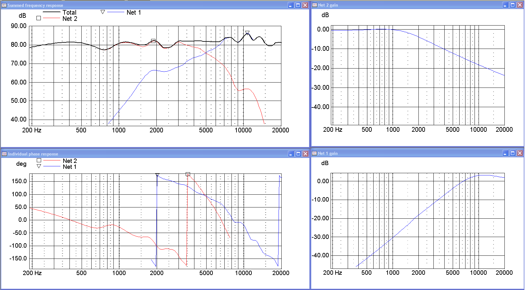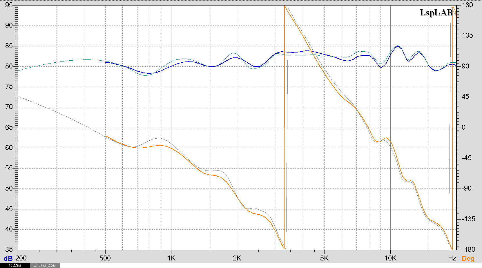 Для расстояния 2.5м АЧХ и ФЧХ выглядят так. (справа, электрические АЧХ ФНЧ и ФВЧ).