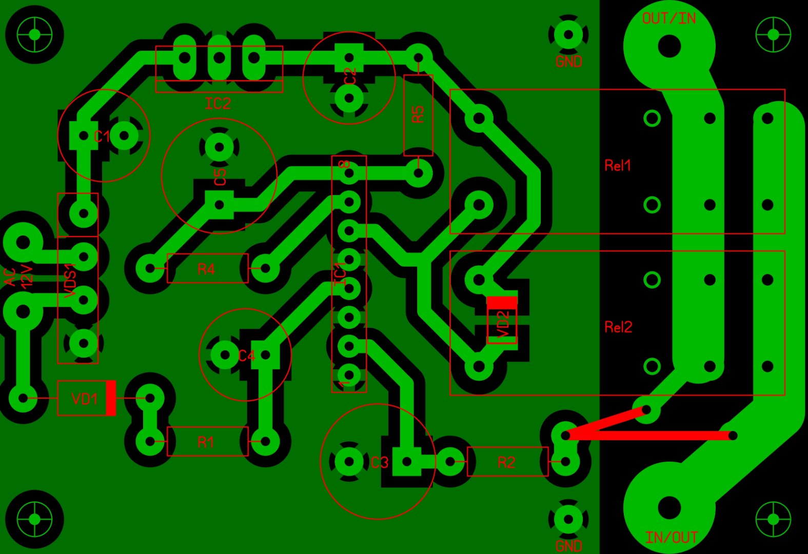 Вона повністю симетрична, можна ставити і праворуч і ліворуч, змінюється лише перемичка. Для особливих гурманів можна купити реле краще, наприклад FINDER 40.52.9.012.5000 з позолоченими контактами. Платку робив для посилювача АВ.