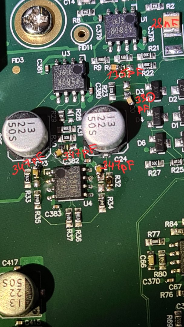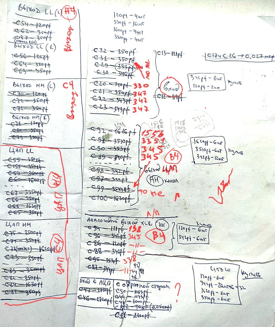 Ок, все выложу наглядно. Но пока все еще раз хочу перемерить, у меня не сходятся некоторые номиналы кондеров с автором проекта. Притом что процентов шестьдесят сходится. Возможно мы и разные каналы апгрейдили, но все равно все каналы по обвязке наверное должны быть по соответствию одинаковые. Возможно ревизии плат разные. Но ОУ то одни и те же . У меня небольшой опыт. Так что ХЗ, может допустимы такие отклонения номиналов. Сегодня вечером постараюсь еще раз промерить по номерам кондеров, как у автора. Тогда составлю и поделюсь сравнительным списком