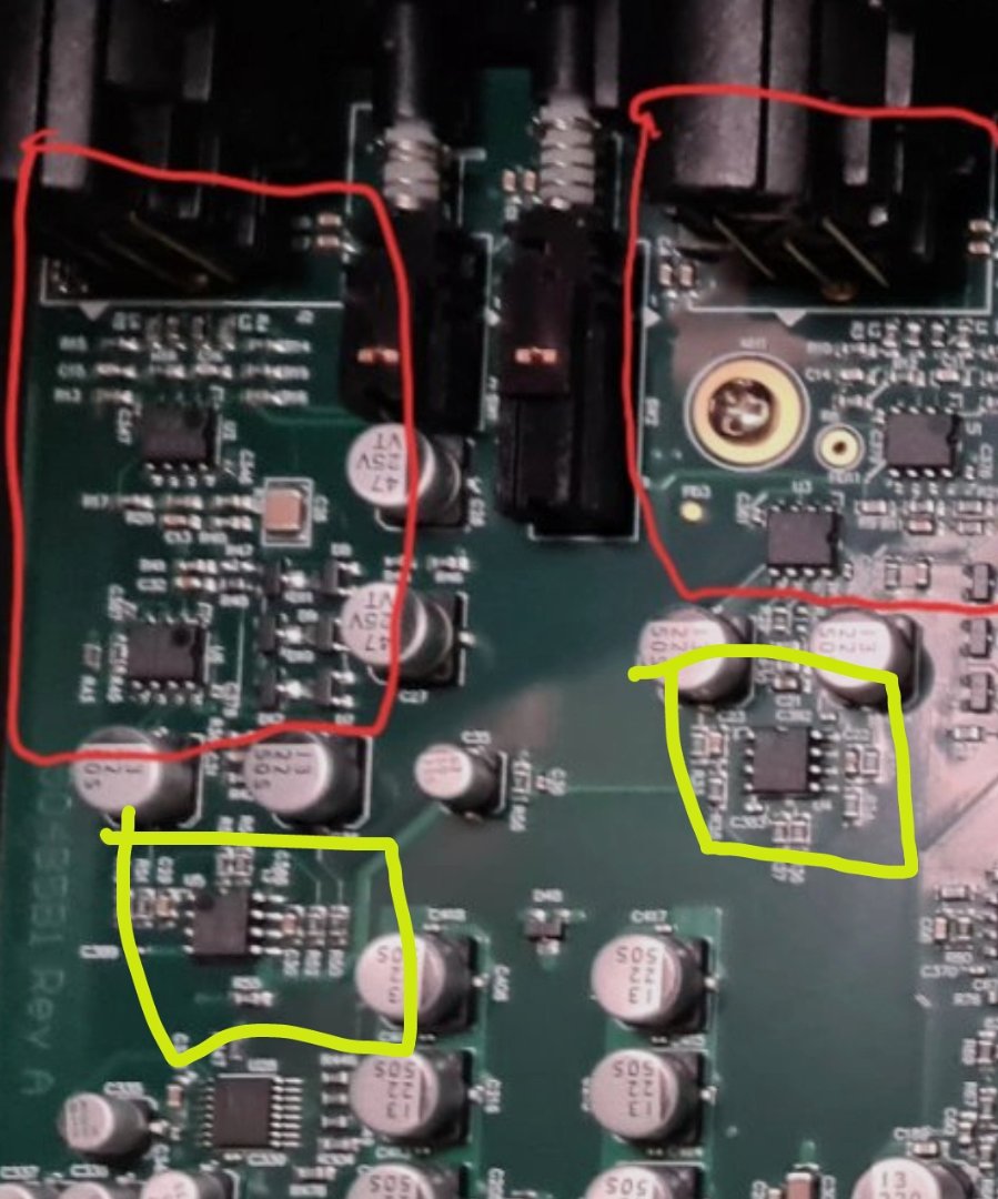 Вопрос про конденсаторы, смотря на видео ориг. изделия ,. видно что в обвязке темно-коричневые есть,. а так же есть пара штук белых на каждый ОУ, это то что попадает в кадр... Ваше мнение? Все же в оригинальном устройстве достаточно много стоят темно-коричневые (в обвязке ОУ)... Или все же лучше их поменять то же?PJK писал(а): 10 мар 2024, 00:14 Конденсаторы для выпаивания необходимо выбирать темно-коричневого цвета в цепях коррекции ОУ.Светло серые, розово-серые, почти белые - не трогаем.