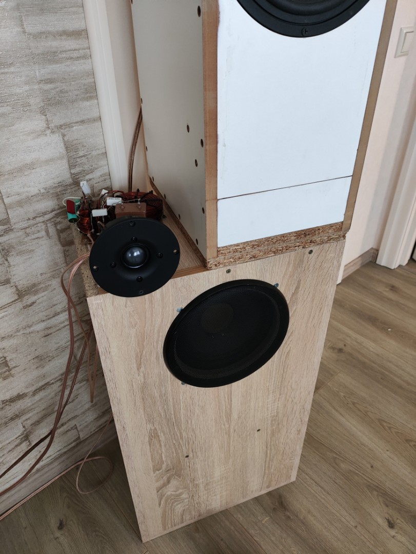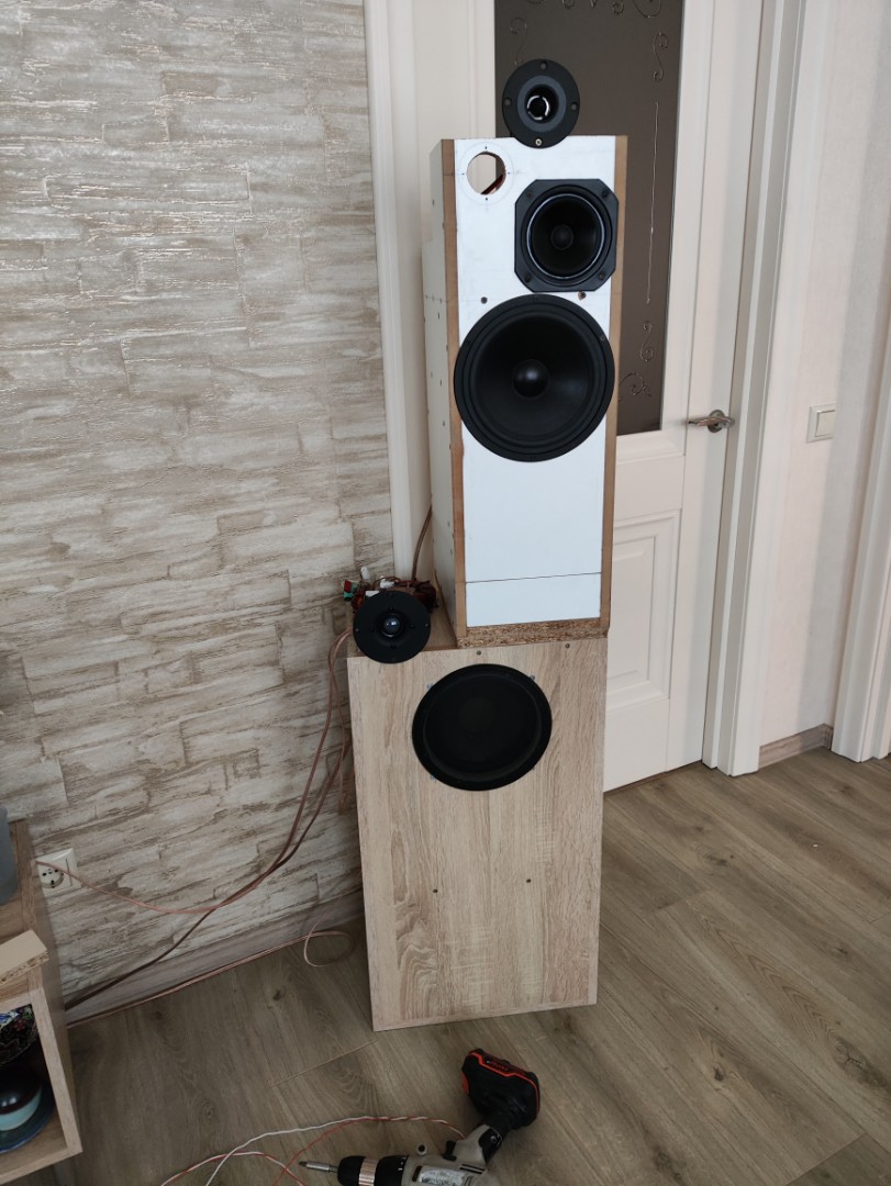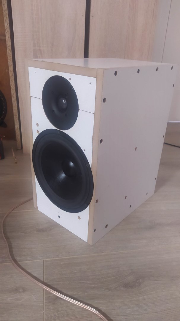 Когда включил оказалось что нч вполне достаточно, хотя в предидущей версии с монакором на нч с этим была проблема. Видимо из-за малого обьема ящика. Я сделал согласно расчетов корпуса обьемом 20л, а этого почему-то оказалось мало. В трехполоске нч секция имеет обьем уже 30л, хотя расчеты опять показывали 20. Не пойму, что я не так меряю. Так вот, в 30 литрах и добротность 0,7 и баса даже с избытком. Правда в трехполоске отдельный усилитель на НЧ. Так вот, подключил обновленную двухполоску в небольшой комнате 3х3 метра, играет очень даже неплохо. Акустика стояла в 1,5 метрах от слушателя (меня))). Все на месте, и микро и макродинамика и в целом звук прям классный. Но все поменялось когда перенес эту акустику в комнату побольше, в гостиную. Расстояние до слушателя уже 2,8 метра и обьем комнаты побольше. И звук как-то потускнел (. Включал попеременно с трехполосной акустикой с переключением "на лету" так трехполоска выигрывает однозначно, у нее звук четче и прозрачнее. А у двухполоски в сравнении как-то мутноватый или замыленный. Получается, моя двухполоска подходит для небольших комнат, хотя полочной ее уже не назовешь