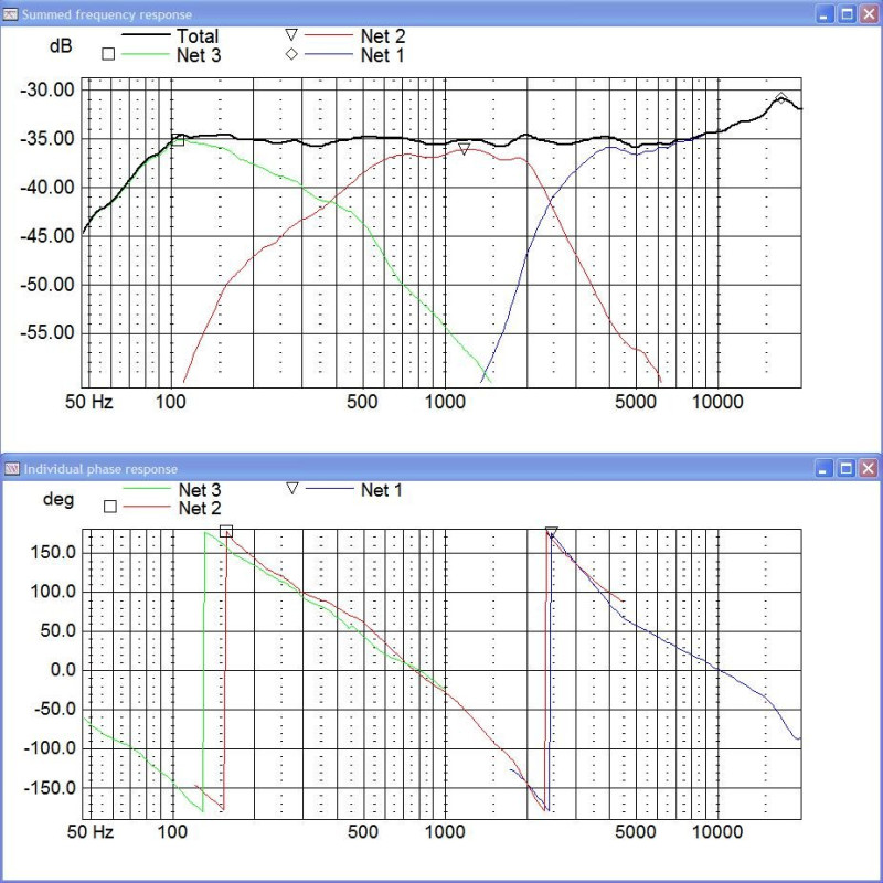 Ну да, можно, но почему вы не сделали степ в зоне прослушивания? Ведь вся эта катовася с выравниванием задержек между полосами нужна, что бы в зоне прислушивания иметь сумму трёх полос без запаздыванний одной полосы, относительно другой полосы. На показанных ранее картинках LR24 и 48, в дсп три полосы создаются с помощью LR, потом полосы суммируются и строится степ, что бы увидеть как фазовые сдвиги пассивных фильтров в каждой полосе, влияют на конечный результат, и это всё без влияния динамиков т.е. это та красота которая приходит на динамик после пассивного фильтра. Задержек в полосах нету т.е. нет выравнивание степа.