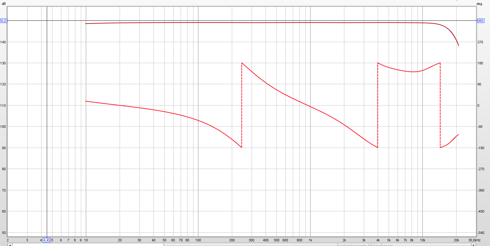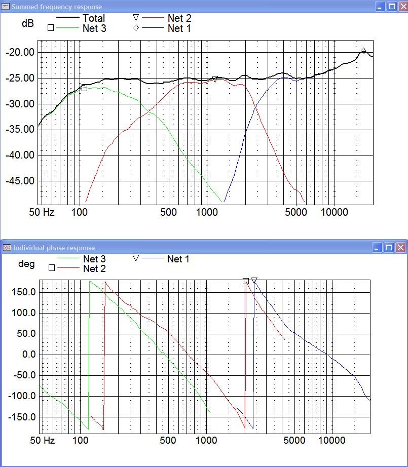 Ну да, можно, но почему вы не сделали степ в зоне прослушивания? Ведь вся эта катовася с выравниванием задержек между полосами нужна, что бы в зоне прислушивания иметь сумму трёх полос без запаздыванний одной полосы, относительно другой полосы. На показанных ранее картинках LR24 и 48, в дсп три полосы создаются с помощью LR, потом полосы суммируются и строится степ, что бы увидеть как фазовые сдвиги пассивных фильтров в каждой полосе, влияют на конечный результат, и это всё без влияния динамиков т.е. это та красота которая приходит на динамик после пассивного фильтра. Задержек в полосах нету т.е. нет выравнивание степа.Justas* писал(а): 28 окт 2023, 18:52 Задержку от фильтров как писал выше, можно глянуть микрофоном. По степу, по импульсу.